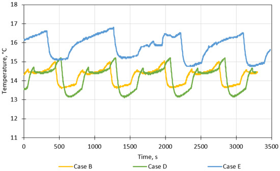 The temperature inside the evaporator for different numbers of nozzles is shown in Figure 13. The temperature inside the evaporator is higher when three nozzles (case E) are used than when six nozzles (cases B and D) are used. The average evaporator temperature for case E is 15.78 °C (standard deviation of 0.60 °C), while for six nozzles (cases B and D), it is about 14 °C. A higher temperature in the evaporator in case E results in a higher temperature for the chilled water generated in the evaporator. Thus, reducing the number of nozzles is not advisable if low-temperature chilled water is required.