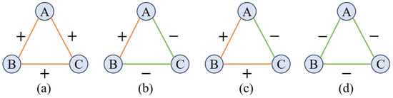 The structural balance theory revolves around the analysis of balance within triangles in a network. In a signed network, the relationships within symbolic triangles can be classified into four patterns, as illustrated in Figure 2. The first two triangles (Figure 2a,b) are considered structurally balanced, while the last two triangles (Figure 2c,d) are considered structurally unbalanced. To quantify the global balance of a signed network, this study utilizes the ratio of balanced triangles [24,40] as a measure of the overall balance within the renewable energy trade coopetition system among countries along the route. This ratio is denoted as and is calculated as follows: