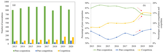 The evolutionary trends in the number and proportion of the three relationship types. (a) The evolutionary trends in the number of the three relationship types. (b) The evolutionary trends in the proportion of the three relationship types.