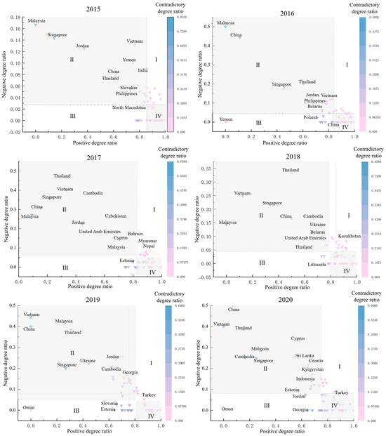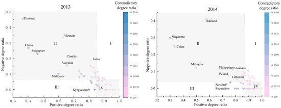 Figure 4 illustrates the distribution of , , and for each country. The dashed lines represent the mean values and divide the figure into four quadrants: quadrants I–IV. From Figure 4, it is evident that the symbols with darker colors are primarily concentrated in quadrant II and quadrant III, with quadrant II showing a particularly significant presence. This indicates that these countries exhibit less pure cooperation and more complex coopetition. Notably, China, Singapore, and Malaysia have consistently maintained a high level of coopetition relationship throughout the entire study period. This suggests a complex dynamic of competition and cooperation between these three countries and other countries along the BRI. Similarly, by 2020, Cambodia, Vietnam, and Thailand demonstrated similar multifaceted coopetition dynamics. Indeed, renewable energy competition is prevalent among the BRI countries due to shared objectives and interests. The global focus on environmental conservation and sustainable development drives the development and utilization of renewable energy, with countries seeking market dominance and technological superiority. However, the BRI also provides a valuable platform to enhance cooperation in renewable energy through technical exchanges, project collaborations, and more. Such collaboration promotes advancements in renewable energy technologies and industries. Taking China, India, and Sri Lanka as examples, each country possesses unique strengths. Sri Lanka boasts abundant natural resources, particularly in solar and wind energy, while China and India demonstrate robust technical and industrial capabilities in these fields. Through collaboration with countries like China and India, Sri Lanka can fully leverage its resource advantages to develop and utilize renewable energy. Such cooperation contributes to enhancing Sri Lanka’s energy supply stability, reducing energy costs, fostering economic development, and decreasing reliance on traditional energy sources.