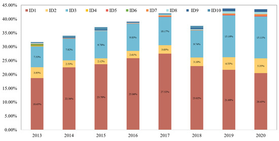 Figure 6 illustrates the changing proportions of the ten subgraphs. Overall, with the exception of 2018, the proportions of the subgraphs exhibit an increasing trend, indicating the significant impact of the BRI. Specifically, the proportions of ID1 and ID3 experienced substantial growth, from 18.65% and 7.53% in 2013 to 27.52% and 10.17% in 2017, respectively, highlighting the importance of these two subgraphs. However, in 2018, the proportions of these two subgraphs decreased, leading to an overall decline in the proportions of the subgraphs. In 2019 and 2020, the proportion of ID3 significantly increased again, reaching 15.11%, while ID2 also fluctuated upwards to 5.35%. It is worth noting that, despite the declining trend of ID1 after reaching its peak in 2017, its proportion remained high at 20.45% in 2020, making it the most common subgraph among them all. This indicates that ID1 and ID3 represent the most prevalent patterns of renewable energy trade relations among the BRI countries.
