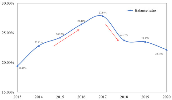 Figure 7 illustrates the upward trend in the global balanced rate since the inception of the BRI. The ratio peaked at 27.84% in 2017 and then gradually declined but remained at 22.17% in 2020, surpassing the level of the initiative’s proposal year. This suggests that the implementation of the BRI has fostered stability in trade relations among countries along the routes. However, starting from 2018, the balanced rate began to decrease, while the unbalanced rate saw an annual increase. This indicates that the stability of relations between countries has been somewhat affected. Furthermore, Figure 6 provides additional insights into the evolution of the balanced and unbalanced subgraphs. The study reveals that the decline in the global balance rate is primarily due to the reduction in balanced subgraph ID1, coupled with an increase in unbalanced subgraphs ID2 and ID3, particularly ID3. This underscores the presence of contradictory edges between nodes, suggesting that the blend of cooperation and competition has increased uncertainty in trade relations between countries, thereby impacting their stability to some extent.