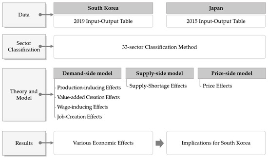 This article aims to draw implications after analyzing the national economic roles and economic effects of the EPSs in South Korea and Japan by synthesizing the models developed in various previous studies. Therefore, this analysis is different from a meta-analysis, which estimates a single equation by synthesizing the main results of various previous studies. Specifically, the procedure for applying the IO techniques used in this study consists of data, sector classification, theory and model, and derivation of results. Figure 1 presents a flowchart summarizing the entire process followed in this study.