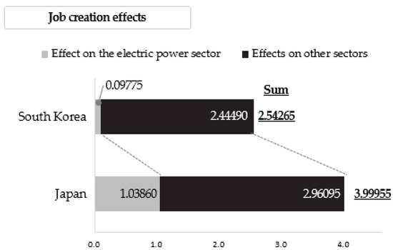 The results of examining the job-creation effects of USD 1.0 million worth of investment or production in the EPSs of both countries are shown in Table 5. Since the South Korean currency unit and the Japanese currency unit are different, the job-creation effect was, for convenience, calculated based on the USD using exchange-rate information [69]. The number of people employed in the power sector per USD 1.0 million of production in South Korea and Japan is about 0.10 and 1.04, respectively. The latter is more than 10 times that of the former. South Korea has a relatively small number of employees in the EPS. Compared to the South Korean EPS, the Japanese EPS seems to be more labor intensive. The job-creation effects of the South Korean and Japanese EPSs on other sectors are about 2.44 and 2.96, respectively. The latter is greater than the former. Therefore, the total job-creation effects are 2.54 and 4.00, respectively. The total job-creation effects of USD 1.0 million of investment or production in the South Korean and Japanese EPSs are illustrated in Figure 5. Those in Japan are much greater than those in South Korea. The higher job-creation effect does not necessarily mean that the electric power industry structure is more desirable. However, the fact that the total job-creation effect of the EPS in South Korea is smaller than that in Japan suggests that South Korea needs to enhance the job-creation effect.