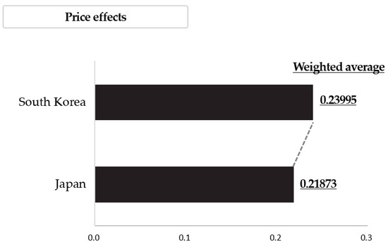Looking at the price effect for South Korea by sector, sector 9 (basic metal products), sector 17 (water supply, sewage, waste treatment, and disposal services), and sector 8 (nonmetallic mineral products) have the largest values. In these sectors, since electricity bills account for a relatively large fraction of the total production cost of the output, the price effect seems to be large. On the other hand, sector 26 (business support services) and sector 27 (public administration, defense, and social security services) have low price effects. As for Japan, the price effects for sector 9 (basic metal products), sector 17 (water supply, sewage, waste treatment, and disposal services), and sector 8 (nonmetallic mineral products) are large, which is interestingly the same as in South Korea. The sectors with low price effects are sector 2 (mined and quarried goods) and sector 24 (real estate services).