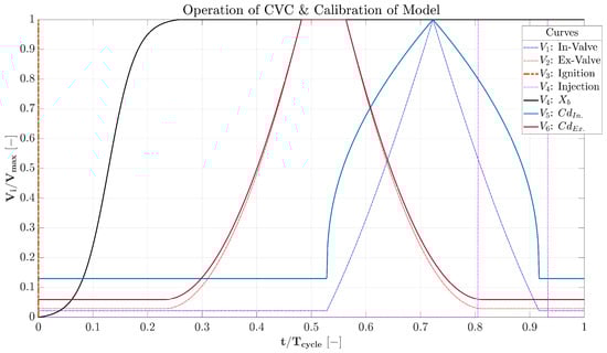 Another central parameter of the CVC performance is the non-dimensional burning rate. In this paper, the use of the Hyperbolic Tangent Function (Equation (11)) is proposed instead of traditional curves (e.g., Wiebe Function [38]). The reason behind this choice derives from the terms and , which ensure the proper adjustment of the duration and steepness of the burning rate, respectively. A proper calibration of the combustion start, of the combustion end, and of the gradient of the curve over time is needed to match the experimental trace. The selected tuning parameters can be found in Table 2, and the corresponding burning profile is depicted in Figure 2. It is worth observing that combustion ends after the opening of the exhaust valve.