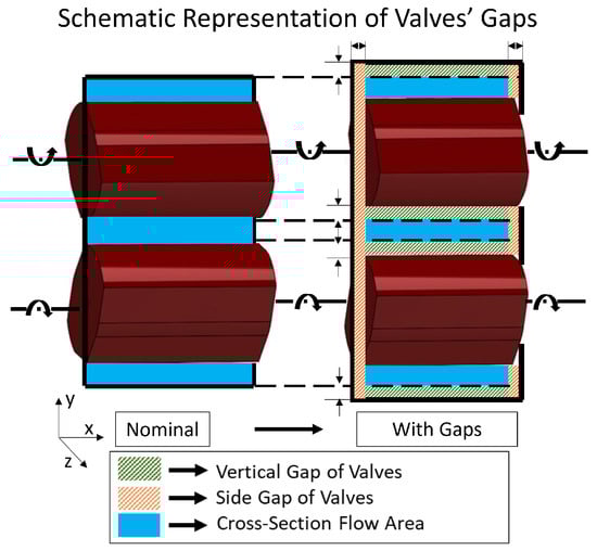 A critical step of the analysis is the handling of the intake–exhaust valves. It is necessary to define a time-dependent profile of the valves’ discharge coefficients in order to calculate the mass flow rate (Equation (1)) of the related control volumes. A proper modification of the cross-sectional area and discharge coefficients must, in fact, be performed to treat the rotary valves as equivalent poppet ones. The model reproduces the real cross-sectional areas of the double-rotary valves both for the intake and the exhaust. Still, the rotary valves’ area does not vary from a nil value to a maximum one. In Figure 3, it is illustrated how gaps arise in the lateral sides and the vertical contact point due to friction with the lateral walls and between the engaging profiles, respectively. It is very important to include such gap values to model the CVC chamber as a continuously open control volume. Consequently, the nominal area plus the ensemble gap’s additional area are embedded in the lash of the model’s actual lift.