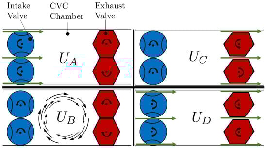 After determining the enthalpy addition to the chamber, the heat transfer coefficient of the combustor should be computed to define the heat loss term in the energy equation (Equation (8)) of this component. The 1D model considers the combustion chamber as a single control volume. Therefore, the velocities of the chamber’s boundaries are calculated for each time step. Nonetheless, for the computation of the CVC heat losses, the transient spatial-average kinetic profile inside of the chamber should be estimated. The proposed profile is given by Equation (13), and the different states of rotary valves are depicted in Figure 4. When only one of the valves is open (: Intake or : Exhaust), the velocity inside the chamber is governed by the throat valve velocity. However, inside the combustor, the velocity of the burned gases is not the same. Hence, it is necessary to introduce a scale factor to connect the velocity between the two locations. Therefore, the combustor’s velocity is given as a product of the throat valve velocity and a scaled factor ( and ). These factors (Equation (15)) are obtained by evaluating the continuity across the valves’ throat and the chamber’s middle cross-sectional area K (Equation (14)).