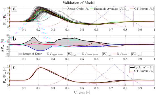 In Figure 5b, the percentage pressure difference between the simulation and the ensemble average can be compared with the percentage pressure difference of the ensemble average to the maximum and lower pressure values, respectively. Altogether, the numerical trace is always fixed within an acceptable range. Some minor exceptions () are to be ascribed to the difficulty of using a 1D model to capture the 3D complex phenomena as well as to the very tight range () of the experimental data in specific time frames.