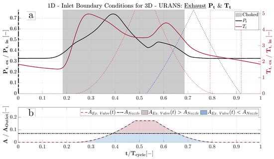 It is clearly evident that the raised pressure ratio chokes the nozzle for almost half of the cycle. In parallel, the exhaust valves’ cross-sectional area is transient. When they are slightly open, they result in the minimum area of the system, controlling the chamber’s mass flow. When they are fully open, the nozzle’s throat is smaller (almost half of the valve’s nominal area) and takes control of the exhaust flow. This sequential change of the exhaust system’s controlling component, exhaust valves or nozzle, is presented in Figure 6b, where the y-abscissa is dimensionless with the help of the cross-sectional area of the exhaust plenum (.