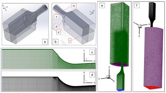 In Figure 7a,b the iso-views of the exhaust flow domain which consists of a rectangular plenum coupled with a transition duct that connects it with a circular converging–diverging nozzle are shown. As it can been seen, the domain can be separated into four identical volumes using the double symmetry of planes x-z and y-z. Therefore, the analysis can be performed on only one volume assuming a symmetric behaviour of the flow on these planes. Consequently, the computational cost is significantly reduced. In addition, Figure 7c,d present the mesh of the exhaust system which is constructed using tetrahedral elements placed on the z-axis. Moreover, 22 prismatic layers are stacked close to the viscous walls in order to properly resolve the viscous sub-layer preserving below 1. From Figure 7c to Figure 7f, different colours are used to highlight the selected boundary condition coherently with colours reported in Table 4, where the properties of the flow are also present.