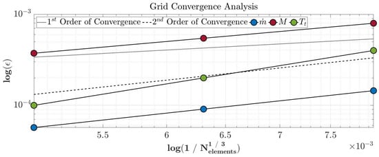 The properties of the mesh are elected after performing a grid dependence analysis that consists of 3 steady CFD RANS simulations imposing the boundary conditions of the period’s instance that results in the maximum mass flow. In particular, the high pressure ratio leads to an over-expanded nozzle. The results of this analysis based on the theory of Roache [42] are presented in Table 5. The properties of mass flow rate, mass flow-weighted average Mach number, and mass flow-weighted average stagnation temperature at the inlet of the nozzle (label “iii” in Figure 7b) were selected for the purpose of this study. The Grid Convergence Index (GCI) decreased from coarse–medium to medium–fine for the three properties providing values of the asymptotic range of convergence very close to 1.