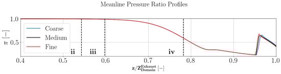 The variation of the relative errors for the three properties at the inlet of the nozzle are plotted in a logarithmic scale in Figure 8. For each flow property, the values of the three grids are compared with the value obtained by the Richardson extrapolation. The mass flow rate and mass flow-weighted average stagnation temperature converge with an order higher than 2, while for the mass flow-weighted average Mach number, the order is . Furthermore, the centre-line pressure ratio profiles from “i” to “v” (see Figure 7b) are reported for the three grids in Figure 9. As it can be observed, the position of the shock slightly changes from coarse to medium mesh while only the local value is modified by ≈3% when moving from medium to fine mesh. Based on the information provided, it can be concluded that the grid size of the medium meshed volume provides grid-independent results. The total amount of elements of the selected mesh is ≈4 × .