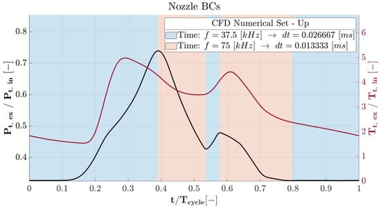 The URANS equations were solved using a density-based implicit solver with a 2nd order accuracy. The medium was considered an ideal gas by imposing the cycle-averaged properties of the burned gases ( [J/(kg K)] and [kg/kmol]). The calculation using the 1D model showed a limited variation of the exhaust products’ properties (% and %). Hence, the assumption of constant thermodynamic properties of the exhaust products was made for the sake of calculation simplicity. Turbulence was calculated with the k- model proposed by Wilcox [41]. The operating frequency was 25 Hz ( s). Due to the rapid decrease in stagnation pressure, it was necessary to impose a variable time step during the computation, as reported in Figure 10. The analysis started with a coarse time step that guaranteed a numerical sampling frequency of kHz. Later, when the stagnation pressure was reduced, the numerical sampling frequency was increased up to 75 kHz. The following short recuperation of pressure allowed for analysing the development of the flow with a lower sampling frequency kHz, while, later, the analysis returned to 75 kHz. The end of the cycle was calculated with kHz. Such approach does not impact the accuracy of the computation but reduces the computational cost.