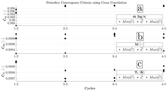 In Figure 11, the minimum, average, and maximum of each matrix are presented in the three graphs for four comparisons of the five cycles. In terms of mass flow, at the fifth cycle, the three properties of the normalised cross-correlation for zero lag are above . The same is also true for the mass flow-weighted average Mach number and mass flow-weighted average stagnation temperature, corroborating the fact that the periodicity is established in the flow field for the fifth resolved period.