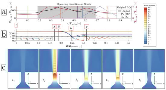 The transient inlet stagnation pressure of the system varies its operating conditions with time. The different conditions of the exhaust system are depicted in Figure 12. In Figure 12a, the intake properties of the system can be recognised. The stagnation pressure and temperature over the period are plotted, accompanied by the time window of the choked nozzle. Furthermore, five vertical coloured lines indicate the different analysed operating instances. In Figure 12b, the centre-line profile of the pressure ratio over the axial length of the nozzle for various time steps can be retrieved. Moreover, the locations of the inlet of the exhaust domain (i), inlet of the transition piece (ii), inlet of the nozzle (iii), throat of the nozzle (iv), and outlet of the nozzle (v) are presented in accordance with Figure 7b. Finally, in Figure 12c, the Mach number contour of the exhaust nozzle for these instances is presented.