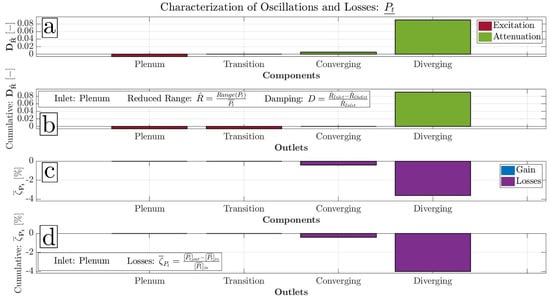 On that point, it would be very useful to define some metrics of evaluation for the exhaust system for the fifth analysed cycle. The property that is chosen to be used is the stagnation pressure. Apparently, in terms of efficiency, the characterisation of the cycle-averaged stagnation pressure losses () through each part of the exhaust system should be performed. In addition, the level of excitation or attenuation of the fluctuations of the CVC exhaust’s total pressure it should be calculated for each of the downstream parts. Therefore, the reduced range of a signal is used here, which is computed by the division of the range with its average. As a result, the difference between inlet and outlet in terms of the reduced range can give the damping factor , as was introduced by Liu et al. [25]. If this factor is positive, the signal is attenuated. On the other hand, if it is negative, the signal is excited. Consequently, the losses and oscillation characterisation of a component can be performed using Equation (29).