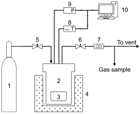 Schematic diagram of the autoclave system (1—high-purity Ar, 2—autoclave, 3—crucible, 4—furnace, 5—inlet valve, 6—outlet valve, 7—wet gas flowmeter, 8—temperature sensor, 9—pressure sensor, and 10—computer).
