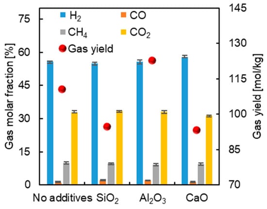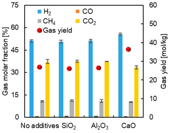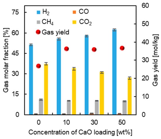 As shown in Figure 2, compared with other cases, adding CaO resulted in a larger share of H2 and a smaller share of CO2, which was caused by the solidification effect of CaO. Figure 5 shows the gas product components of different CaO additions as the CaO loading increased, the molar fraction of H2 further increased and the molar fraction of CO2 further decreased. This further proves the CaO adsorption effect. From Figure 5, it can also be seen that with the increase in CaO addition, the gas yield does not increase significantly, and even slightly decreases at 30 wt% addition. This is also due to the solidification of CO2 in the gas into calcite.