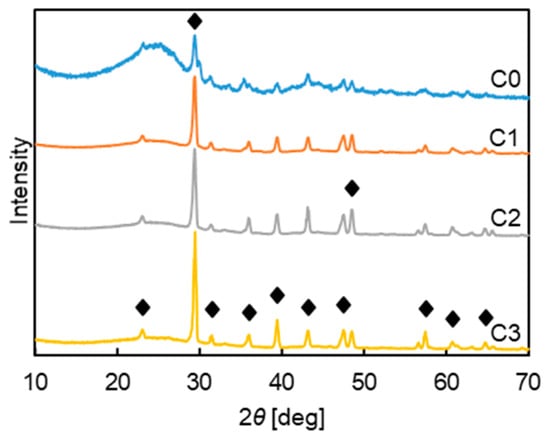 XRD patterns of solid products with/without CaO at 750 °C (C0/C1/C2/C3—0/10/30/50 wt% CaO, ♦ calcite (CaCO3)).