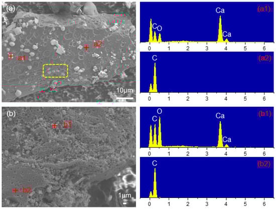 SEM-EDX images of solid productions with 10 wt% CaO. (a,b) are SEM images of different solid particles in the solid productions, respectively; (a1,a2) are EDX spectrums of the a1 and a2 test spots in (a), respectively; (b1,b2) are EDX spectrums of the b1 and b2 test spots in (b), respectively.