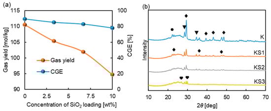 Effect of SiO2 on gas productions and its own transformation with 40 wt% K2CO3. (a) Effect of different SiO2 loadings on gas productions; (b) XRD patterns of solid productions at different SiO2 loading; K/KS1/KS2/KS3—0/3.33/6.67/10 wt% SiO2, ● mordenite ((Ca, Na2, K2) Al2Si10O24·7H2O), ▼ kalsilite (KAlSiO4), ♦ calcite (CaCO3), ♥ wollastonite (CaSiO3).