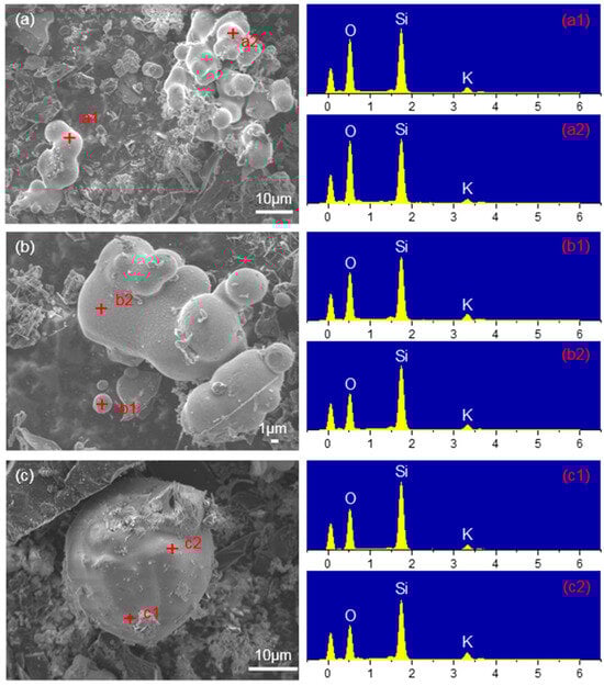 SEM-EDX images of solid productions with 10 wt% SiO2 and 40 wt% K2CO3. (a–c) are SEM images of different solid particles in the solid productions, respectively; (a1,a2) are EDX spectrums of the a1 and a2 test spots in (a), respectively; (b1,b2) are EDX spectrums of the b1 and b2 test spots in (b), respectively; (c1,c2) are EDX spectrums of the c1 and c2 test spots in (c), respectively.
