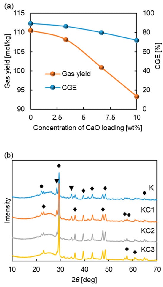 When studying the steam gasification of coal char, Jiang et al. [40] believed that the addition of calcium species (Ca(OH)2, Ca(CH3COO)2, or CaCO3) would produce a synergistic effect with K2CO3 and improve the CGE due to the inhibiting deactivation of K2CO3 caused by calcium species. The XRD pattern in Figure 10b shows that as the amount of CaO added increased, the amount of KAlSiO4 (no catalytic activity, obtained via the reaction of mineral components in semi-coke with K2CO3 catalyst) gradually decreased. This indicated that CaO indeed inhibits K2CO3 inactivation. However, the gas yield and CGE results (as shown in Figure 11a) confirmed that in the current study, gasification inhibition caused by calcite sintering and agglomeration played a major role, rather than the promotion of gasification caused by inhibiting K2CO3 inactivation. Arnold et al. [41] also showed that when the CGE was high, the ash’s fusion state had a significant effect on solid carbon gasification, and the catalytic gasification of K2CO3 was suppressed due to CaCO3 sintering.