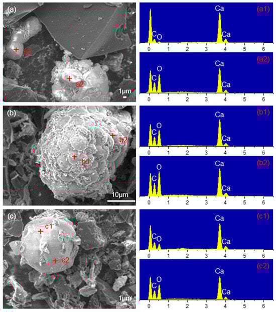 SEM-EDX images of solid productions with 10 wt% CaO and 40 wt% K2CO3. (a–c) are SEM images of different solid particles in the solid productions, respectively; (a1,a2) are EDX spectrums of the a1 and a2 test spots in (a), respectively; (b1,b2) are EDX spectrums of the b1 and b2 test spots in (b), respectively; (c1,c2) are EDX spectrums of the c1 and c2 test spots in (c), respectively.