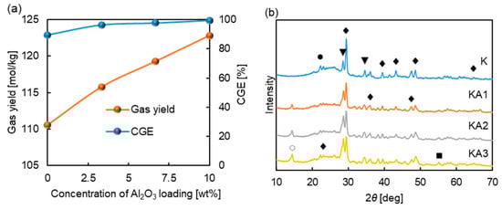 Effect of Al2O3 on gas productions and its own transformation with 40 wt% K2CO3. (a) Effect of different Al2O3 loading on gas productions; (b) XRD patterns of solid productions at different Al2O3 loadings; K/KA1/KA2/KA3—0/3.33/6.67/10 wt% Al2O3, ● mordenite ((Ca, Na2, K2) Al2Si10O24·7H2O), ▼ kalsilite (KAlSiO4), ♦ calcite (CaCO3), ○ boehmite (AlO(OH)), ■ Al2O3.