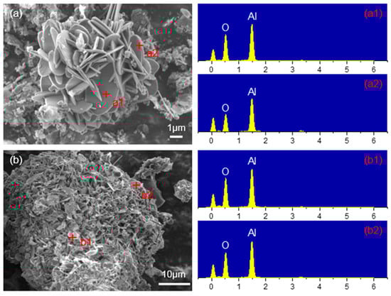SEM-EDX images of solid productions with 10 wt% Al2O3 and 40 wt% K2CO3. (a,b) are SEM images of different solid particles in the solid productions, respectively; (a1,a2) are EDX spectrums of the a1 and a2 test spots in (a), respectively; (b1,b2) are EDX spectrums of the b1 and b2 test spots in (b), respectively.