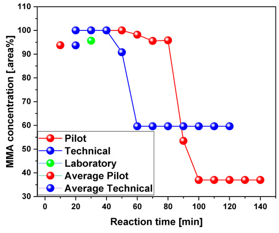 | [40] | Pure PMMA | 400 | 95 | 95 | Fluidized bed | Pilot (14.4 kg/h) |
