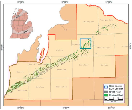 - Miller, J.; Sullivan, C.; Larsen, G.; Kelley, M.; Rike, W.; Gerst, J.; Gupta, N.; Paul, D.; Pardini, R.; Modroo, A. Alternative conceptual geologic models for CO2 injection in a Niagaran pinnacle reef oil field, Northern Michigan, USA. Energy Procedia 2014, 63, 3685–3701. [Google Scholar] [CrossRef]