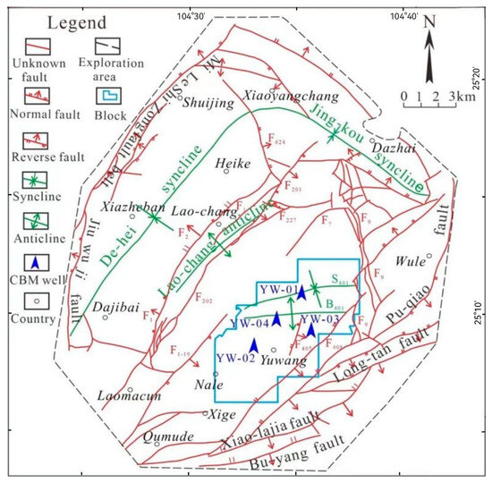The Laochang area in Yunnan is an important coal- and coal bed methane (CBM)-producing area in southern China. Understanding the coal rock structure and properties, as well as calculating the in situ stress of the reservoir, are crucial for the development and utilization of coal and CBM resources. The coal seams in this area are shallow, with numerous layers and a large total thickness [1]; the coal rock fractures are well-developed and often filled with minerals [2]; and the degree of coal metamorphism is high, and anthracite is more developed [3]. The Yuwang block (Figure 1), located in the southeast of the Laochang mining area, is a key block for CBM exploration and development, with the Upper Permian Longtan Formation and the Changxing Formation as the main coal-bearing strata [4]. Scholars have analyzed the characteristics of CBM reservoirs and the production capacity of this block, establishing geological models [5]. However, there is a lack of systematic research on the heterogeneity of the pore and fracture structure of the coal rocks in this area and the characteristics of the response of acoustic emissions. Additionally, research on the in situ stress of coal seams in this area is not comprehensive enough.
