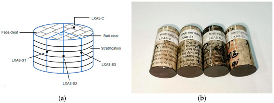 The coal samples were taken from the No. 8 coal seam of the Xiaoaozi coal mine in the Yuwang block of Laochang, which is one of the main coal seams of the Laochang mining area. The types of coal rock are mainly semi-bright coal and semi-dull coal, with a single structure and occasional interbedded gangue [22]. The sampling depth was about 300 m. Standard cylindrical cores with a diameter of 25 mm and a height of 50 mm were drilled from the same coal sample in four different directions (parallel to stratification with face cleat at 0°, 45°, 90°, and vertical stratification, as illustrated in Figure 2a). These cores were sequentially designated as LXA8-S1, LXA8-S2, LXA8-S3, and LXA8-C, respectively (Figure 2b). The industrial analysis of the coal rock was carried out according to the national standard GB/T 212-2008 [23]. The test results are shown in Table 1, which indicates that these coal samples belong to the category of high-ash and low-volatile coal.