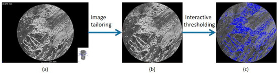 CT image processing: (a) original image; (b) cut image; (c) binarized image (blue color indicates minerals).