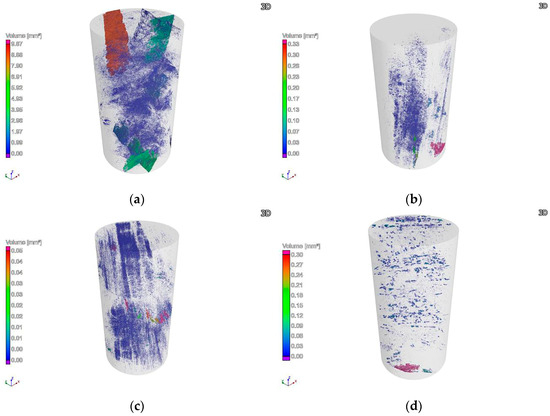 The larger pores and fractures have a significant impact on the acoustic emission counts. Although smaller pores and fractures also emit acoustic signals, they often produce weaker signals that do not reach the threshold for significant recording. Table 5 lists the accumulative acoustic emission counts versus the number of large fractures for each sample. As shown in the table, sample C contains the highest number and volume of large fractures, resulting in the highest cumulative acoustic emission counts among all four samples, much higher than those of the other three samples; sample S1 has 4 fractures with magnitudes ranging from 0.1 to 1 mm3 and 12 fractures ranging from 0.01 to 0.1 mm3; sample S3 has one fracture ranging from 0.1 to 1 mm3 and 148 fractures ranging from 0.01 to 0.1 mm3; sample S2, on the other hand, has no fractures larger than 0.1 mm3, and there are only 15 fractures between 0.01 and 0.1 mm3.