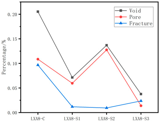 When comparing the number of pores and fractures in each sample (Figure 6a), it is clear that sample S2 has the highest number of pores at 3,999,514; samples C and S1 follow closely, while sample S3 has the lowest number of pores at 338,556. The highest number of fractures was found in sample C with 1609 fractures; sample S1 and sample S2 are next in line, both with 720 fractures; and sample S3 has the lowest number of fractures at 564. As mentioned before, the pores in sample C, with pore diameters located between 14 μm and 28 μm, were not identified as in the other three samples, and the number of pores in this part of the sample is high; so, actually, the number of pores in sample C should be much higher than that of the experimental results. Similarly, sample C could not be compared with the other samples in terms of the average pore volume and average void volume.