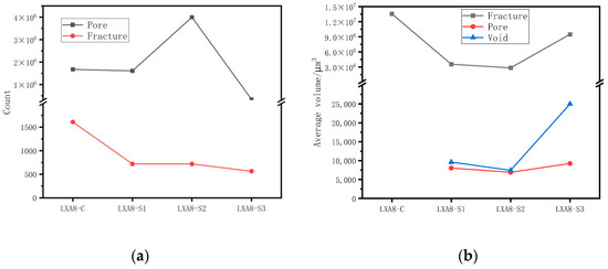 Comparison of the number and average volume of pores and fractures in the four samples: (a) number of pores and fractures; (b) average volume of pores and fractures.