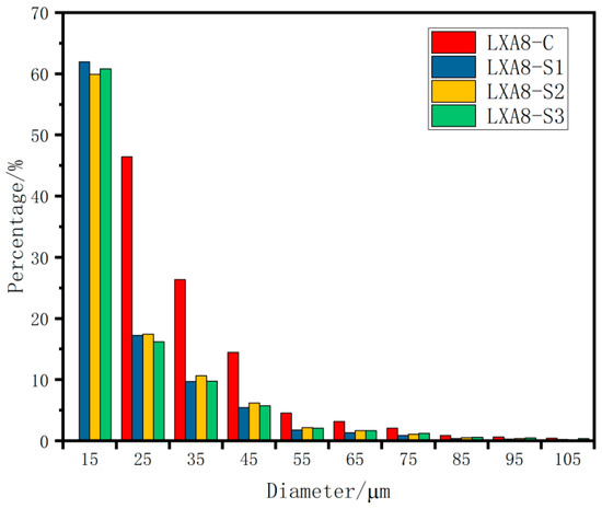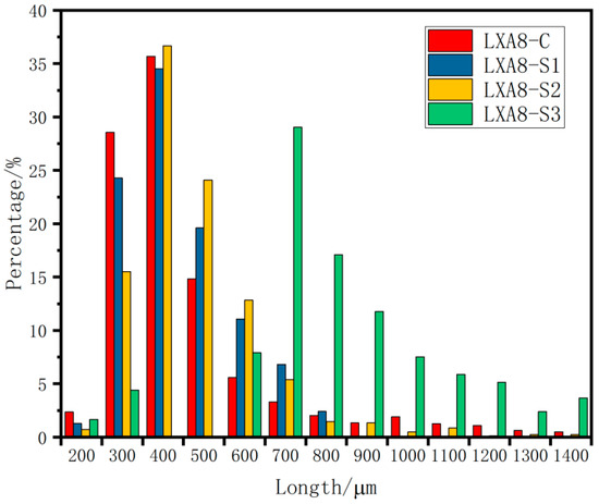 Figure 8 shows the distribution of the fracture lengths of the samples. In general, the fractures with small lengths are in the majority. Among them, samples C, S1, and S2 have the highest percentage of fractures with lengths around 400 μm, and nearly 90% of the fractures have lengths below 600 μm. However, the highest percentage of sample S3 is the fracture with a length of about 700 μm, while fractures with a length of more than 800 μm account for nearly 50%, which is much higher than that of the other three samples. It is worth mentioning that, as shown in Table 2, sample S3 has the lowest number of fractures, but its fracture percentage is higher than that of samples S1 and S2, precisely due to its average fracture length of reaching up to 900 μm and its average fracture volume being higher than that of samples S1 and S2.