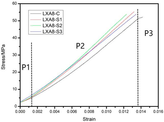Stress–strain curve of the samples (P1: phase 1; P2: phase 2; P3: phase 3).