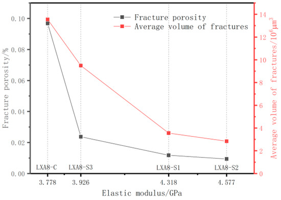 The modulus of elasticity for the four samples exhibits a negative correlation with the percentage of fractures and the average volume of those fractures (Figure 10), which suggests that the elastic properties of the coal rock are related to the development of fractures and that the coal samples with more developed fractures have a lower modulus of elasticity. In particular, the presence of larger micro-fractures may allow more space for the deformation of the coal rock, resulting in a more plasticized material. Moreover, this experiment was carried out at a 10 MPa confining pressure. Previous research by Qi et al. has shown that confining pressure can compress and reduce microporous fractures within the coal rock, leading to increased friction and slip deformation [37], ultimately resulting in a higher measured modulus of elasticity. This observation can also indicate that the pores and fracture space affect the mechanical properties of the coal rock.