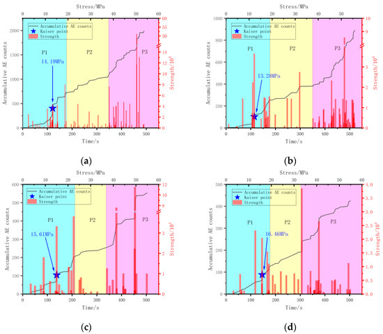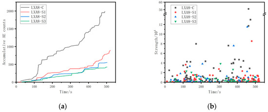 The accumulative acoustic emission count curves and signal strength characteristics of the four samples are shown in Figure 11. The graph can be divided into three phases. In the first phase, lasting approximately 200 s, the acoustic emission signal is dense, with a high signal strength, a high number of events, and a rapid increase in the accumulative counting curve. The second phase spans from approximately 200 to 350 s (from 200 to 300 s for sample S3). During this phase, the acoustic emission signals become sparse, with a lower signal strength, fewer events, and a relatively flat accumulative counting curve. The third phase starts at approximately 350 s (300 s for sample S3). In this phase, the acoustic emission signals are very dense, with high signal strengths and significant values. The number of events is high, and the accumulative counting curve exhibits a steep pattern.