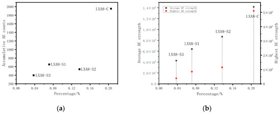 Acoustic emission characterization of the four samples: (a) LXA8-C; (b) LXA8-S1; (c) LXA8-S2; (d) LXA8-S3.