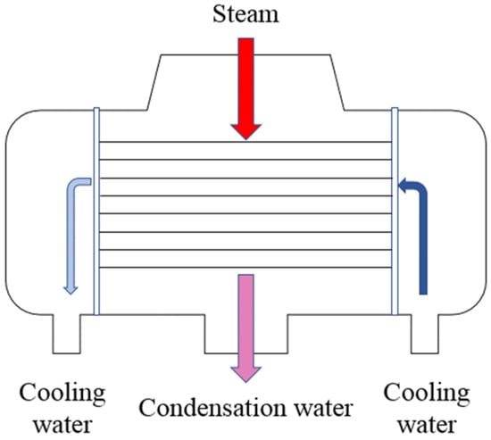 In the thermal design of condensers, empirical formulas are usually used for prediction. Komandur S. Sunder-Ra [1] predicted the performance under various operating conditions using the overall heat transfer coefficient formula of the condenser and proposed corresponding useful suggestions. In order to calculate the heat transfer more accurately, some researchers have adopted new methods. Patankar et al. [2] introduced the volumetric porosity model to calculate the heat transfer of the condenser, and they used the multi-node model to simplify the calculation of the shell-and-tube heat exchanger. In this model, they consider the factors, such as the tube bundle structure and baffles, as the resistance term and incorporate them into the condensation convection heat transfer model. Carlucci et al. [3] simulated the internal flow and heat transfer of the condenser, improved the existing model, and proposed measures to improve the vacuum condition of the condenser and minimize the vibration of the tube bundle. Botsch et al. [4] focused on the study of the dynamic process of shell-and-tube condensers and discussed the changes in their operation. Seungmin Oh et al. [5] conducted an experimental study on the heat transfer process inside a vertical tube bundle surface condenser and its characteristics under different operating conditions.