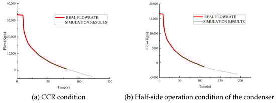 To validate the accuracy of the mathematical calculation model, the simulated circulating water flow response under the CCR (critical condition rate) condition and condenser half-side operation condition is compared with the circulating water pump idle curve provided by the manufacturer, and the specific data are shown in Figure 2. The black curve in the diagram is the condenser outlet flow change process curve provided by the circulating water pump manufacturer under the 100-year low tide level and the design flow condition, and the red curve is the circulating water flow response curve output by the corresponding working condition simulation calculation model. Through the comparison between the two, it can be seen that the flow change data of the circulating water pump are basically consistent, indicating that the validity of the established model is verified and can be used to analyze the pressure change of the condenser under fault conditions.