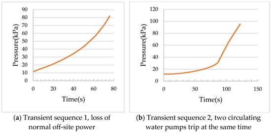By comparison, when the transient sequence is the same, the time for the condenser pressure from 11.8 kPa to reach 30 kPa and 60 kPa in the initial state of condition 1 is shorter, and the time to reach the “unavailable” time is faster, mainly because the turbine exhaust steam flow rate is smaller (about 66%) and the pressure is lower in the initial state of condition 2. When the initial state is the same, the effect of losing normal off-site electricity on the condenser pressure is greater than that of two circulating water pumps tripping at the same time, and the time for the condenser pressure from initial value to 30 kPa and 60 kPa is shorter. Under the initial state of the above different working conditions, whether it is the loss of normal off-site electricity or the simultaneous tripping of two circulating water pumps, the time from the condenser failure (30 kPa) to the condenser unavailability (60 kPa) is greater than 12 s. Considering the establishment of the mathematical model and the determination of the boundary conditions, conservative assumptions have been made. It is reasonable to believe that the condenser of this project can meet the requirement that the turbine bypass steam system can continue to discharge steam to the condenser for 12 s before the internal pressure reaches the “unavailability” set value under the fault condition.