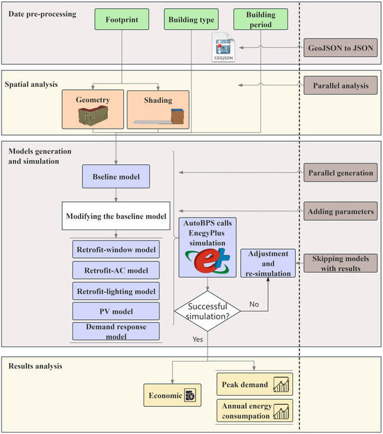 The workflow of this paper is shown in Figure 1. The building information, including footprint, building type and period, is stored in a GeoJSON file. This paper converted GeoJSON files into JSON files by AutoBPS, splitting the original GeoJSON file containing all the building information into multiple JSON files containing information about a single building. Then, spatial analysis was completed to analyze the shading condition and obtain the geometric data of the building. After the spatial analysis, the baseline model was generated according to the building type and standard. The models of retrofit-window, retrofit-AC, retrofit-lighting, PV and demand response were obtained by modifying the baseline model and adding specific parameter settings. These five models replaced the windows, enhanced the AC, upgraded the lighting, covered the 60% roof area PV panels, and induced a temperature reset from 17:00 to 23:00, respectively. AutoBPS can automatically call EnergyPlus and complete the simulation of all models. Finally, the results were analyzed for peak demand, annual energy consumption, and economics.