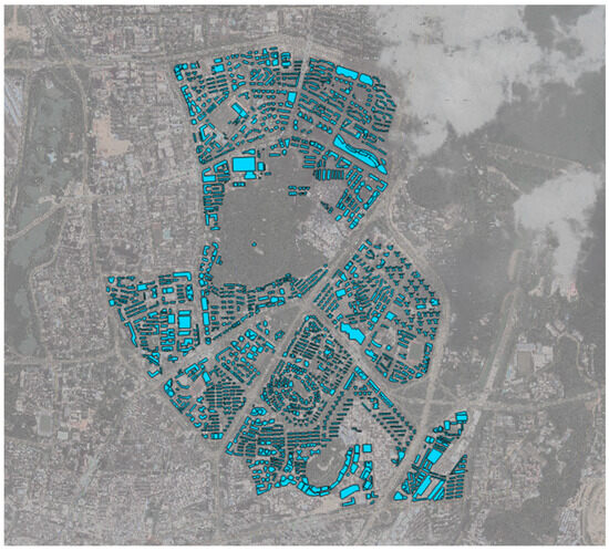 The mixed-use community is located in Shenzhen, China; this area is shown in Figure 2. The building type and period were marked manually. The buildings were divided into residential buildings and public buildings. Residential buildings included high-rise (more than 6 floors) and mid-rise residential buildings (4–6 floors). Public buildings, including offices and hotels, were divided into large public buildings (more than 20,000 m2) and small public buildings (less than 20,000 m2). The remaining buildings were considered as other building types. Other buildings were not counted for energy consumption, but the shading was considered. The period was classified based on the year the standards were published. China published the Design Standard for Energy Efficiency of Residential Buildings in Hot Summer and Warm Winter Zones (JGJ 75-2003 and JGJ 75-2012) in 2003 and 2012 [36,37]. For public buildings, China published the Design Standard for Energy Efficiency of Public Buildings (GB 50189-2005 and GB 50189-2015) in 2005 and 2015 [38,39]. Most buildings in this community were constructed before 2005 or 2003, so the need for a retrofit or energy consumption reduction is more urgent. The detailed information is shown in Table 1.