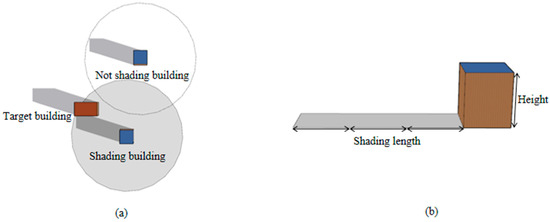 Shading consideration: (a) shading of the target building from surrounding buildings, (b) relationship between shading length and height.
